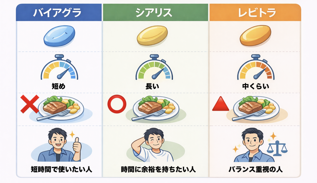 短時間勝負ならバイアグラ、失敗しにくさならシアリス、バランス重視ならレビトラ です。